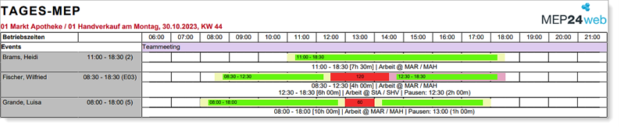 Der Bericht „TagesMEP“ enthält die Tagespläne, diese werden tageweise und nach Abteilung sortiert angezeigt.