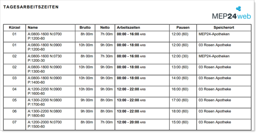 Berichte in MEP24web – Teil 4, Standard: Tagesarbeitszeiten und TagesMEP