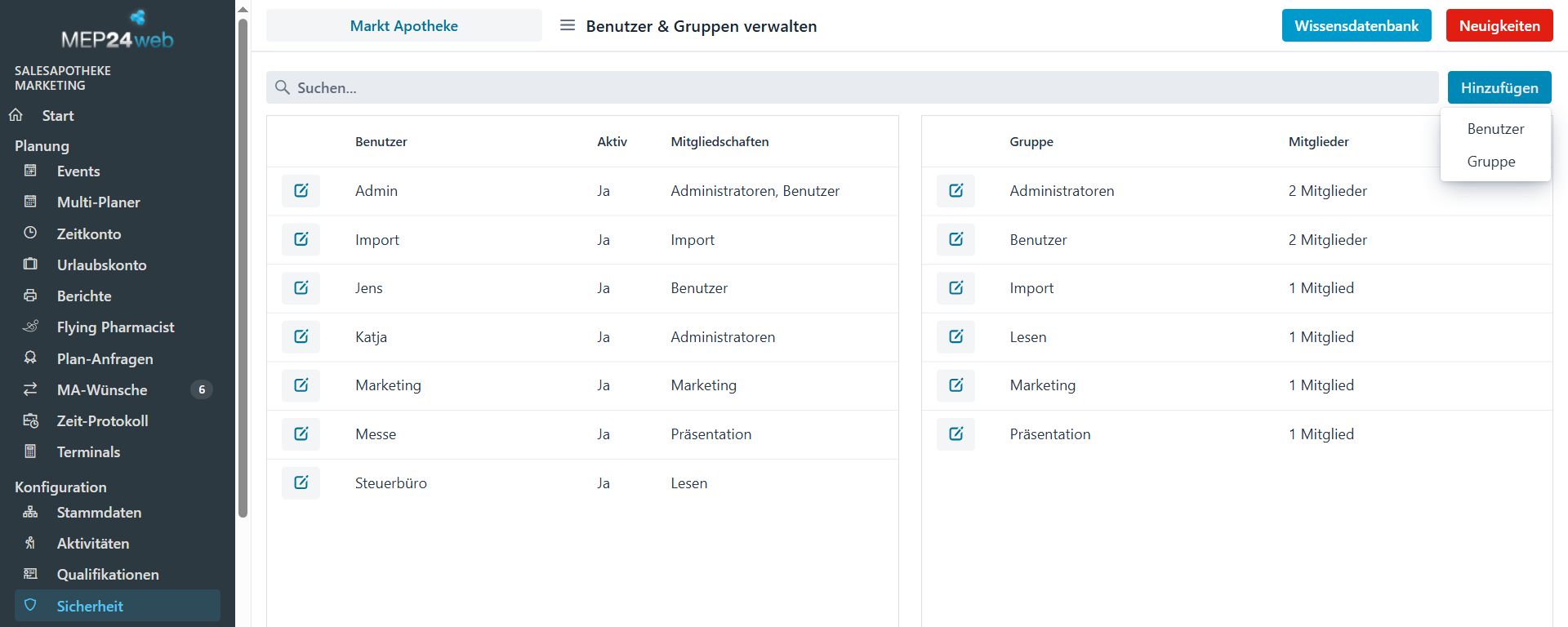 Konfiguration -> Sicherheit -> mit der Maus oben rechts auf „Hinzufügen“ ohne darauf zu klicken -> Gruppe -> Gruppennamen vergeben -> bei „Mitglieder“, Benutzer auswählen -> Erstellen.