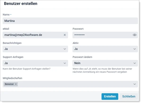 Bitte beachten Sie: Wenn der Benutzer später Anfragen an das MEP24-Support-Team stellen darf, ist die Eingabe einer E-Mail-Adresse hier zwingend notwendig.