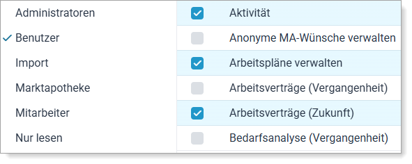 Konfiguration -> Stammdaten -> Organisations-, Filial- oder Abteilungsebene auswählen, für die die Benutzerrechte erteilt werden sollen -> Berechtigungen -> Benutzergruppe links auswählen -> rechts bei den benötigten Rechten den Haken setzen -> Übernehmen.
