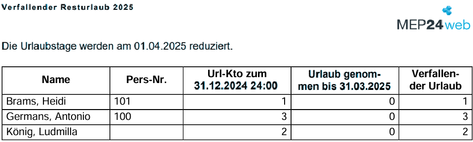 Aber Achtung: Liegen in der Person des Arbeitnehmers dringende Gründe vor, warum dieser einen Resturlaub nicht nehmen konnte, darf der Resturlaub auch zum 31. März nicht verfallen. Dies ist zum Beispiel dann der Fall, wenn der Resturlaub durch eine länger anhaltende Krankheitsphase oder auch aus einem Zeitraum vor Mutterschutz/Elternzeit entstanden ist. Um alle potenziell offenen Urlaubsansprüche aufzulisten, die gegebenenfalls verfallen können, haben wir für Sie den Bericht „Resturlaub“ entwickelt. Dieser Bericht enthält alle betroffenen Mitarbeiter und deren Urlaubsanspruch, welcher zum 31. März verfallen könnte.