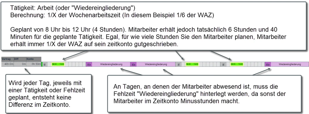 Z.B.: Der Mitarbeiter darf in der ersten Woche 4 Stunden geplant werden, für diesen 4-Stunden-Tag wird das 1/X der Wochenarbeitszeit gutgeschrieben. An allen restlichen Tagen muss die Fehlzeit „Wiedereingliederung“ hinterlegt werden. So entstehen weder Plus- noch Minusstunden.